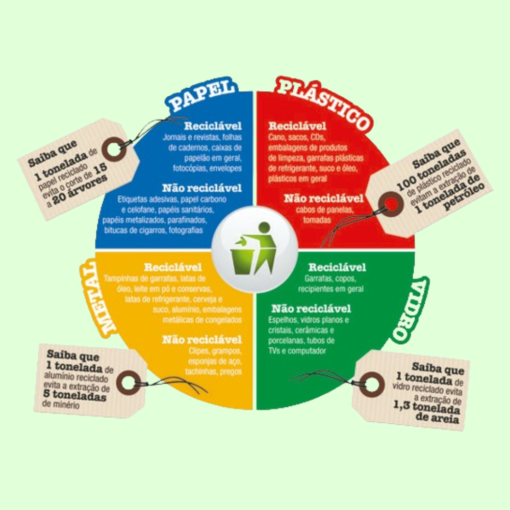 Não Reciclável: espelhos, vidros planos e cristais, cerâmica e porcelana, tubos de tv e computador